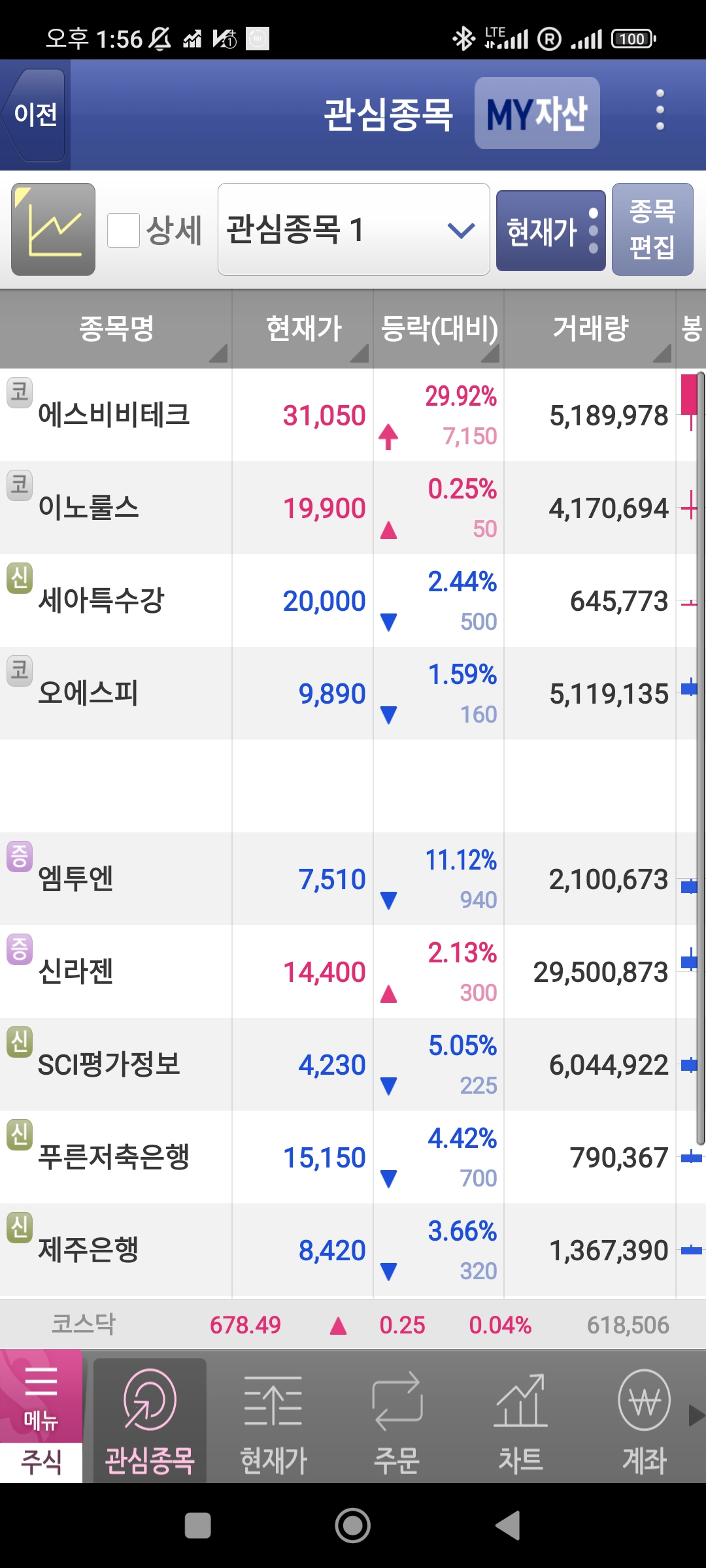 그리고 아래에 요즘 난리인 신라젠과 엠투엔이 있고, 시장이 망가지면 잘 가는 SC평가정보, 푸른저축은행, 제주은행이 있습니다. 그아래에 안보이지만 그냥 심심하면 잘가는 양지사와 한미글로벌이 있었습니다.