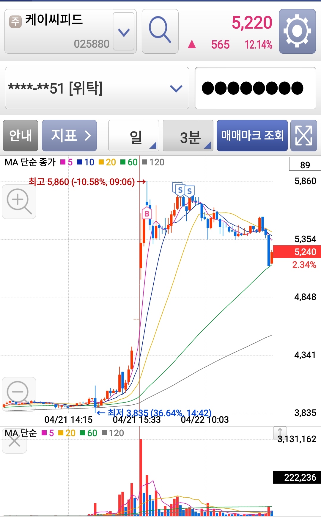 어제 관심종목이었고 종가지존님이 어제 원픽이었다는 영상을 봐서인지, 단타 검색식에 뜨고 거래량이 빵 터져 서리 기준봉 진입하였다.