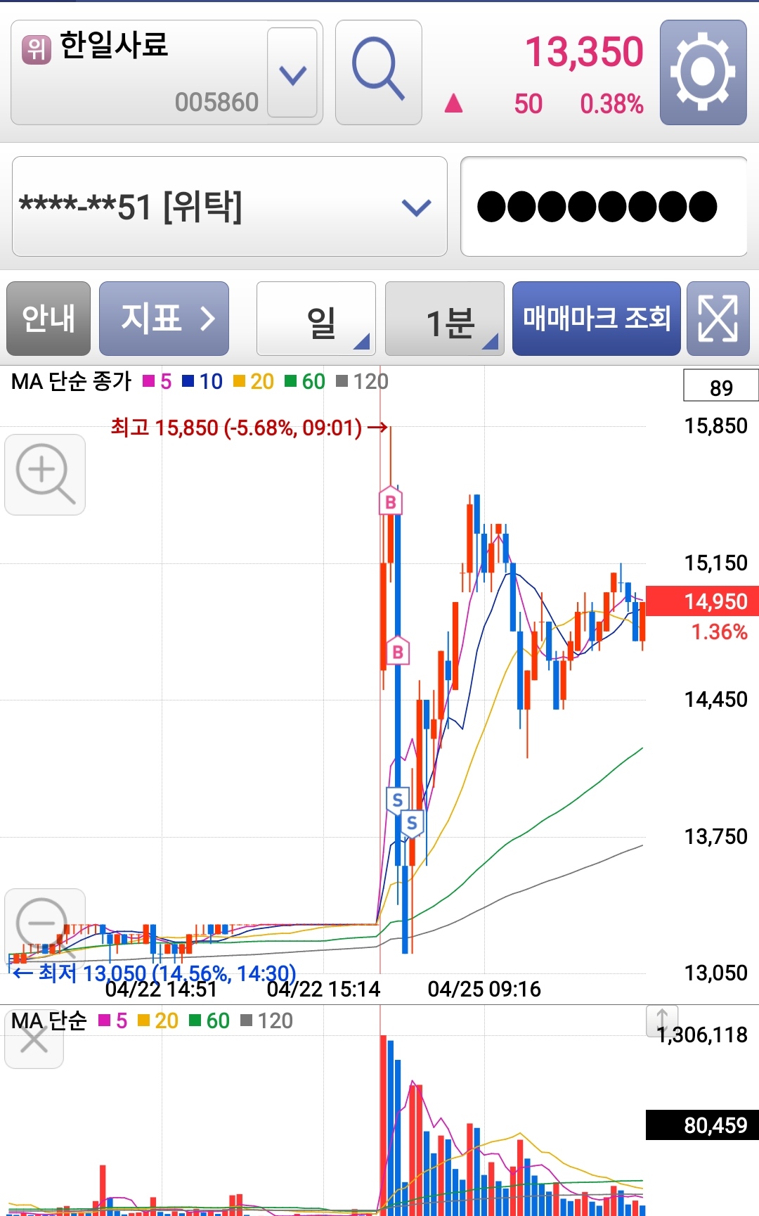 위의 챠트는 1분봉 차트인데요. 첫 매수는 신나게 달릴 때 들어갔고, 시가만 깨지 않으면 버텨보자는 생각으로 두 번째 매수도 들어갔습니다. 매수는 나쁘지 않게 들어간 것 같아요.