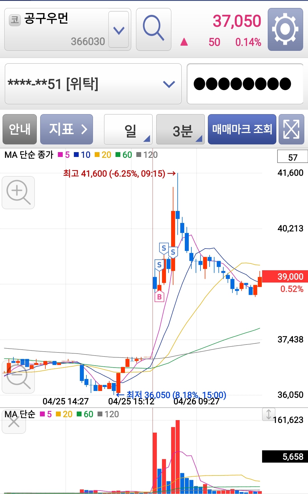 오늘 상단선 5,000원을 돌파하는 것을 보고 바로 따라 붙었는데 5분할로 진입하다 보니 비중을 다 못 들어갔습니다.