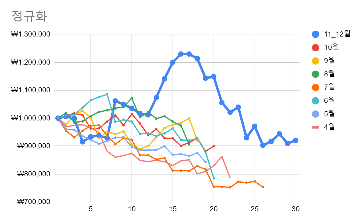 일단 아래 그래프를 보자면 매월 100만원으로 시작했다고 정규화해서 그래프를 그려 본 것입니다.