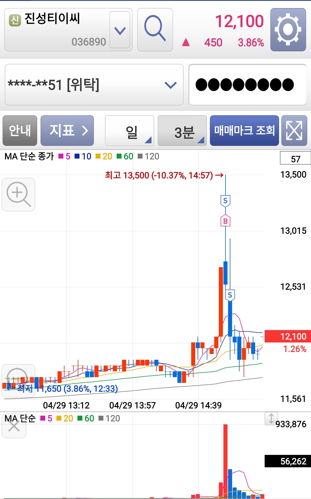 장중 단타 검색식에 떠서 13,000원 손절 잡고 진입해서 1차적으로 조금 팔고, 손절선을 뚫고 내려왔는데 어어어... 하다가 망함.