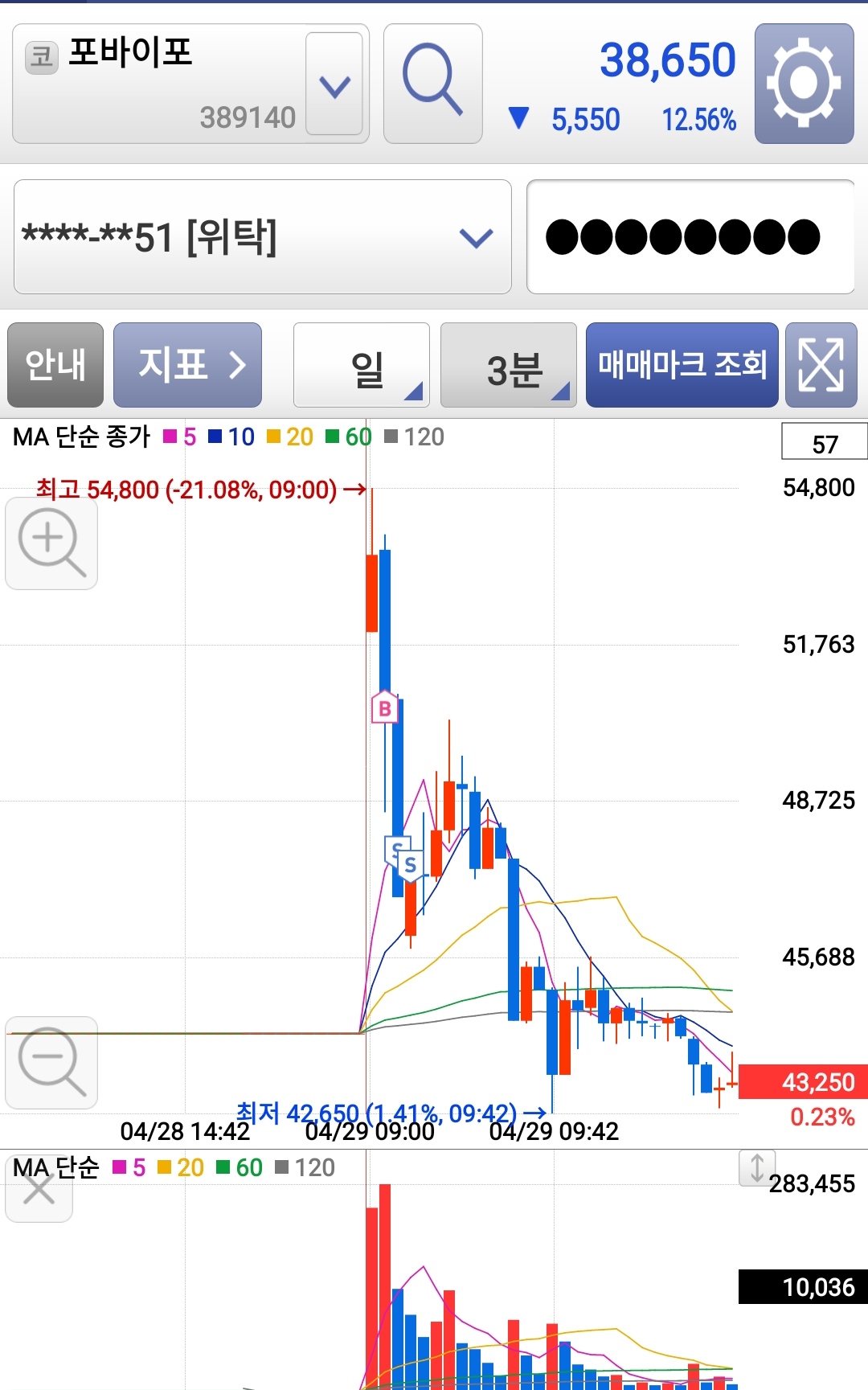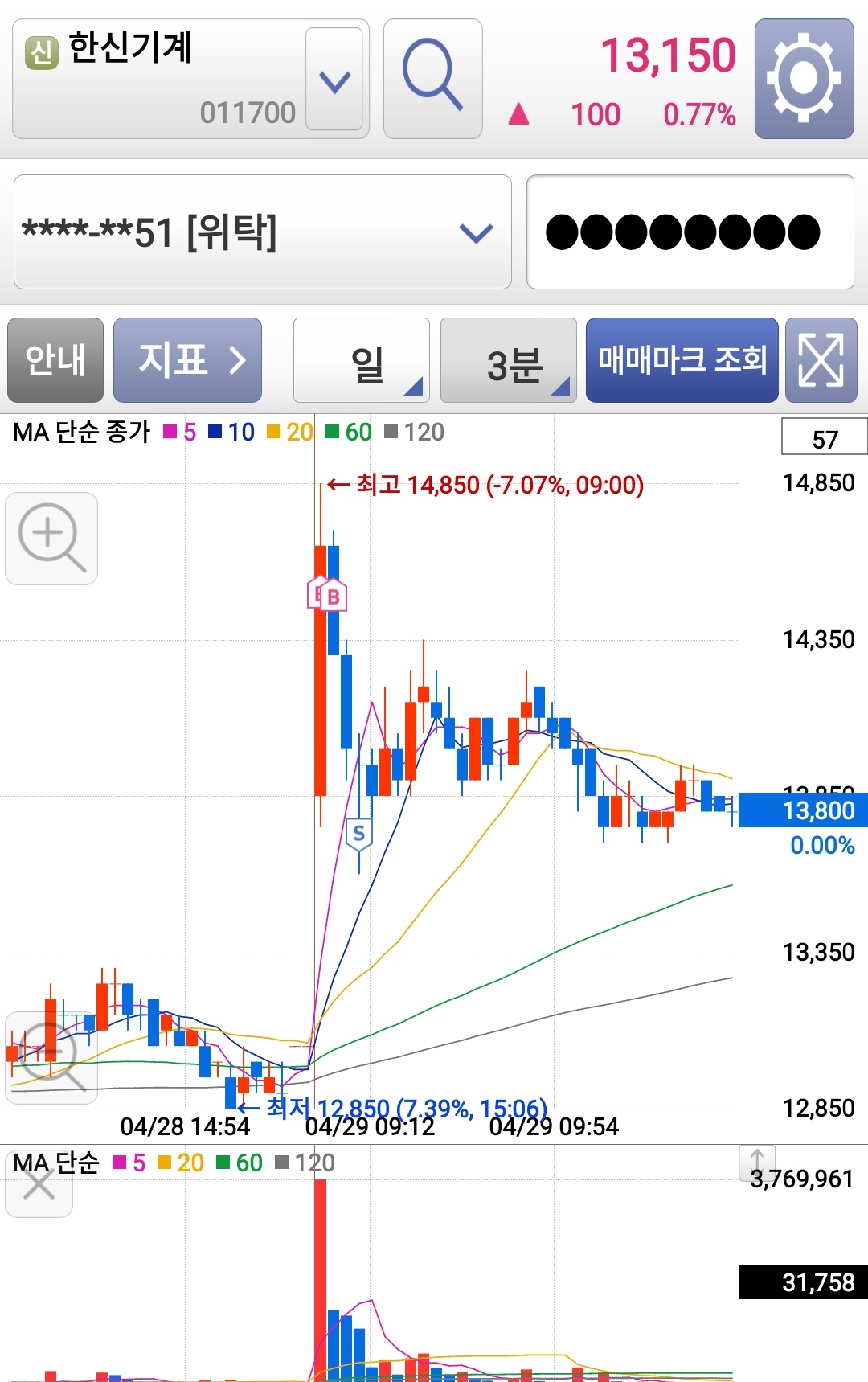 14,500원 돌파 보고 진입했는데 거의 바로 빠지기 시작, 손절선을 14,000원을 생각했는데 조금 있다 생각해보니 너무 낮게 잡음. 거기다 포바이포 대응하느라 정신이 없어서 잠깐 사이에 뚝 떨어져 있는 것을 발견하고 바로 손절했습니다.