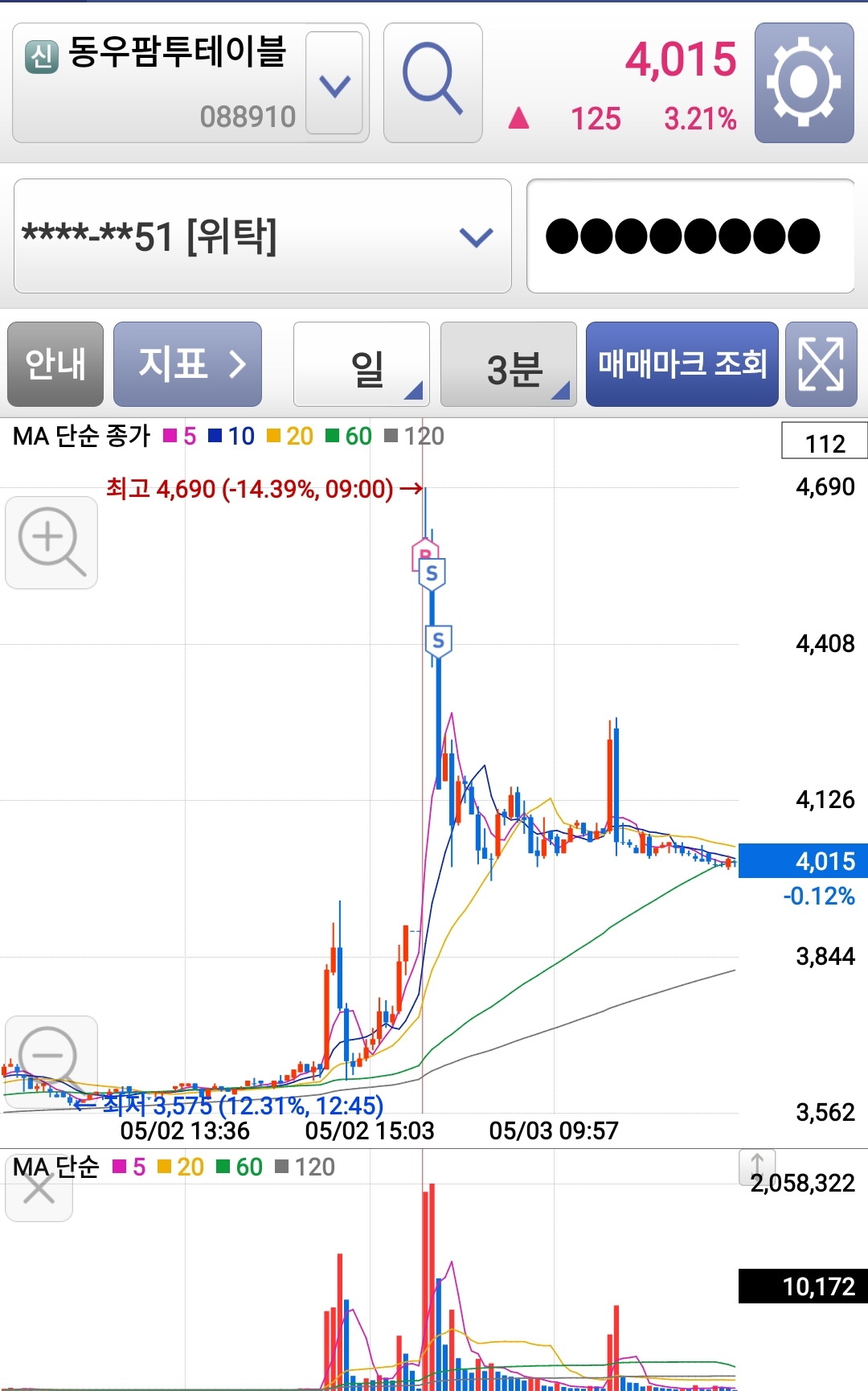 관심종목 중에 들어갈 종목이 없어서 검색 / 거래량 상위 보다가 발견해서 기준봉 진입했습니다.