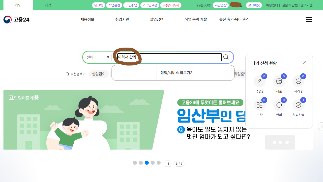 메뉴가 너무너무 많아서 찾아 들어가기는 힘들어요 '이력서 관리'를 검색해 줍니다.