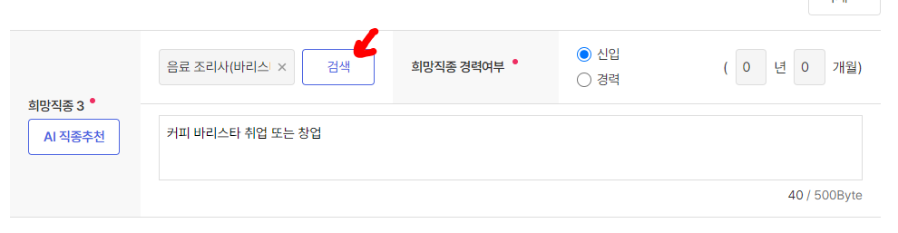 줍니다. 검색 버튼을 눌러 직종을 입력하고 경력여부를 입력 합니다. 아래 내용도 필수 입력이네요.