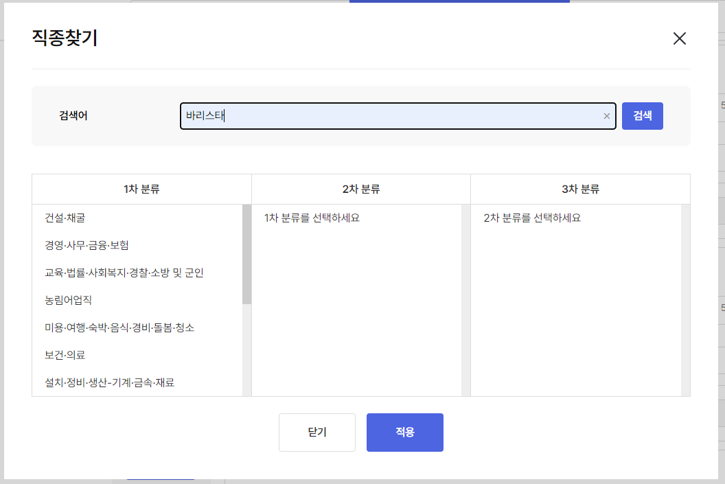 ▼ 직종 분류도 너무너무 많아서 하나하나 들어가서 찾기는 너무 힘듭니다. '바리스타'로 검색합니다.