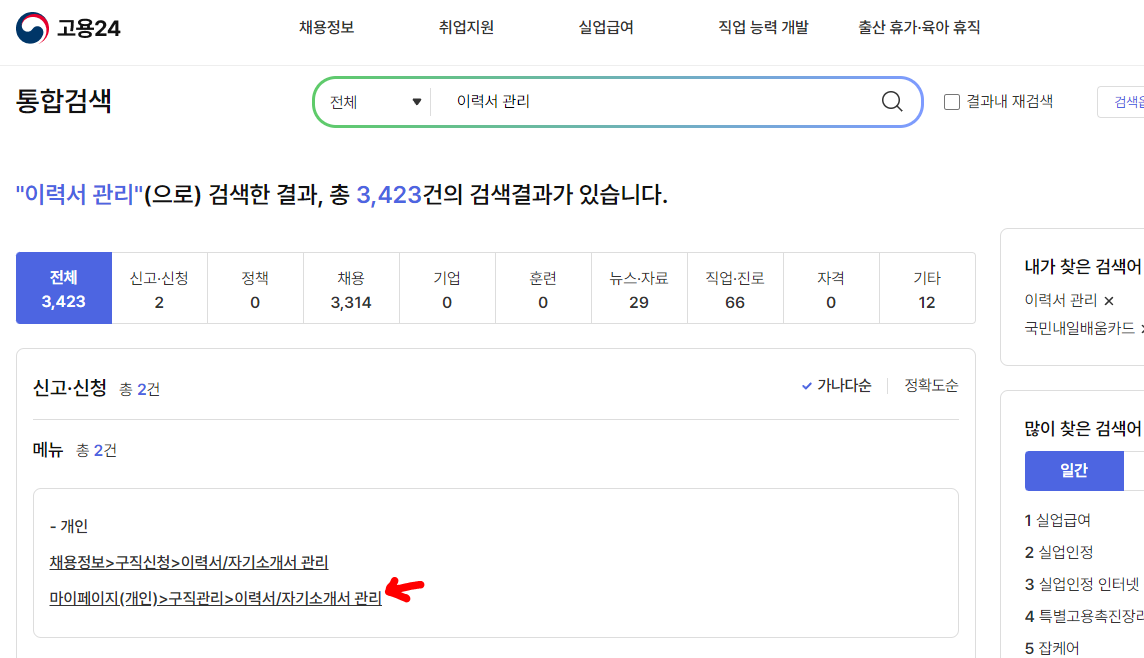 메뉴가 너무너무 많아서 찾아 들어가기는 힘들어요 '이력서 관리'를 검색해 줍니다.