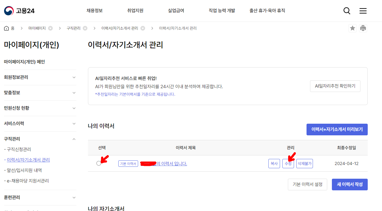▼ '메인페이지(개인)>구직관리>이력서/자기소개서 관리'를 클릭합니다.