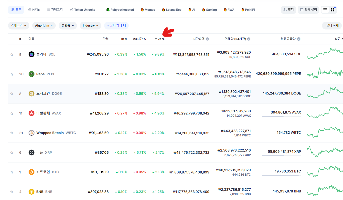 - 상단의 컬럼정렬 중 "7d %"를 눌러 오름차순으로 정렬합니다.