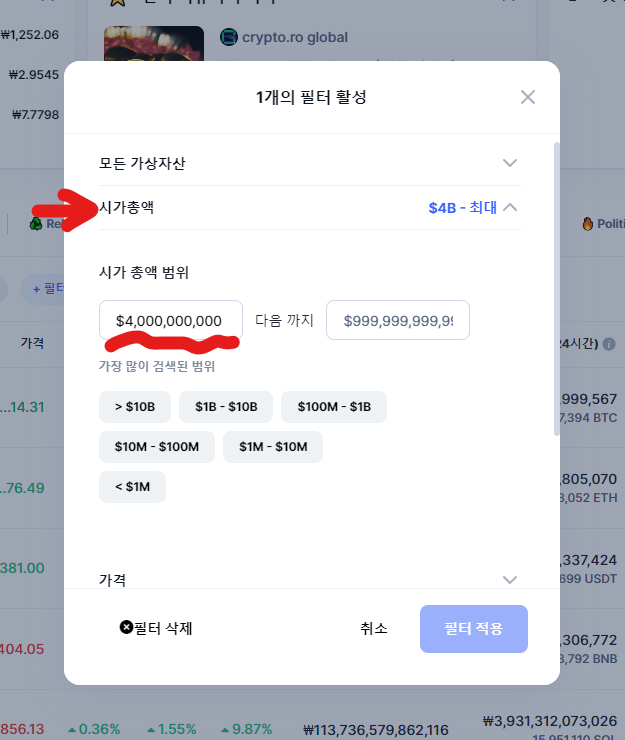 - 시가총액을 선택하고 시가 총액 범위를 $4,000,000,000부터로 수정합니다.