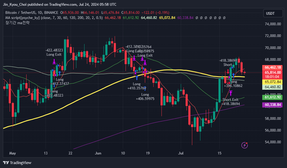 1. 오늘 (2024. 7. 24) 바이넨스 BTC/USDT 기준으로 120일 선위에 가격이 있습니다.