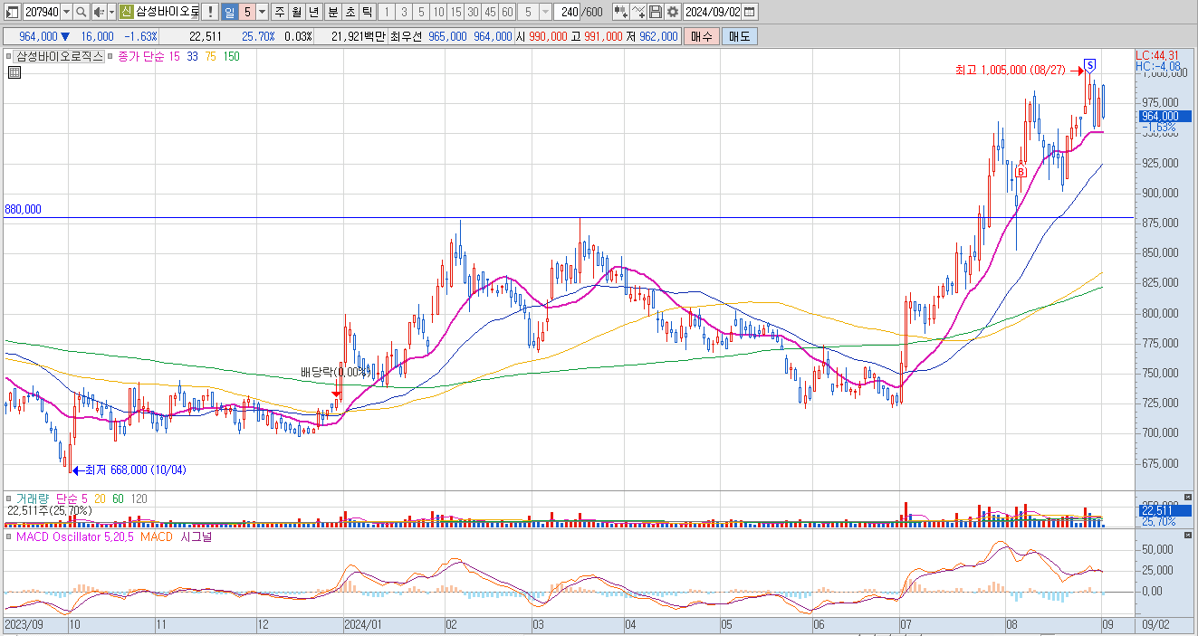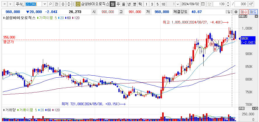 9월 금리인하 기대감으로 최근 바이오 종목들 흐름이 좋다. 계속 모니터링하면서 기회가 있으면 또 매수해야겠다. 하지만 삼성바이오로직스는 중요한 가격대 100만 원이 너무 가까워서 돌파 후 지지하는 걸 보고 진입해야 하나 고민 중이다. 어정쩡하게 매수 들어가 봐야 100만 원에서 저항받을 것으로 보인다.