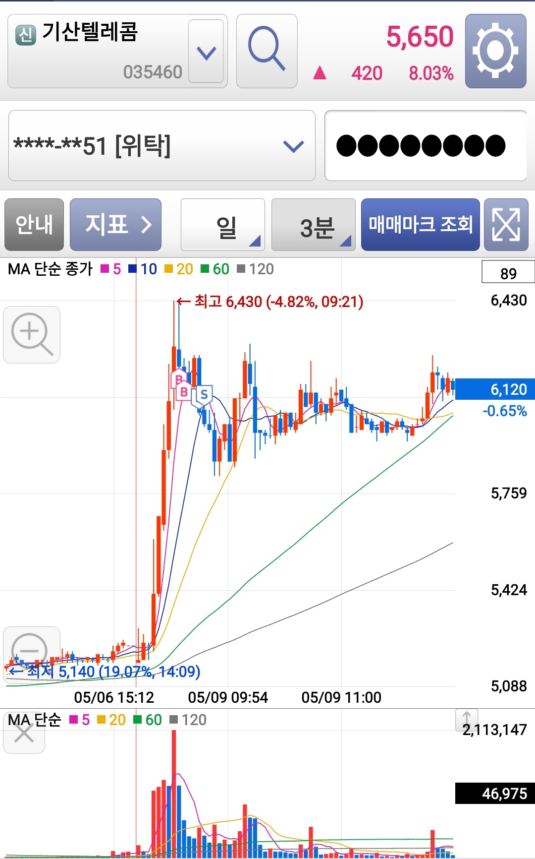 3번째 봉까지 거래량 갱신하는 것 보고 기준봉 아랫부분에서 매수 잘 들어갔습니다.