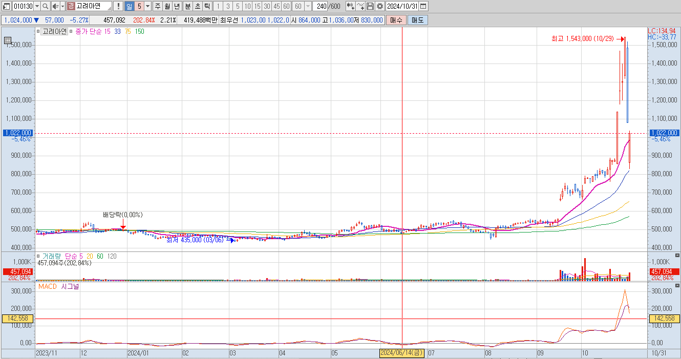 지배권 싸움한다고 급등하고 있는 고려아연이지요.