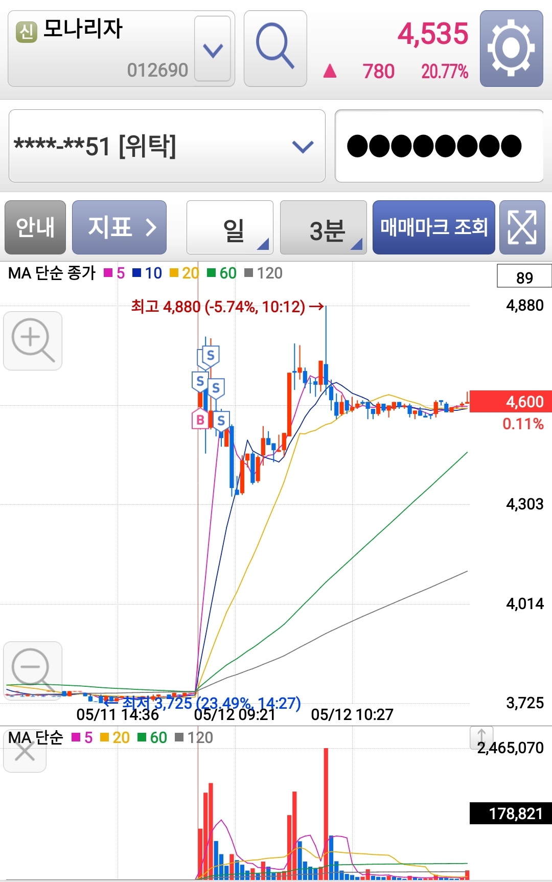 바로 올려줘서 잘 팔았는데, 상한가에 들어가지는 못하고 본전까지 밀려서 마지막 물량은 본전선에서 털었습니다.