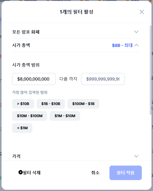 자 이제 리벨런싱 할 종목을 스크린 해봐야겠죠. 코인들 시가총액이 늘어나서 시총범위를 $8,000,000,000 이상으로 넣어야 25종목정도 필터링되네요.
