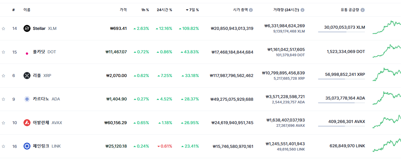 7일 상승률로 정렬해 보면 이번차수는 스텔라, 폴카닷, 리플로 선택되었습니다.