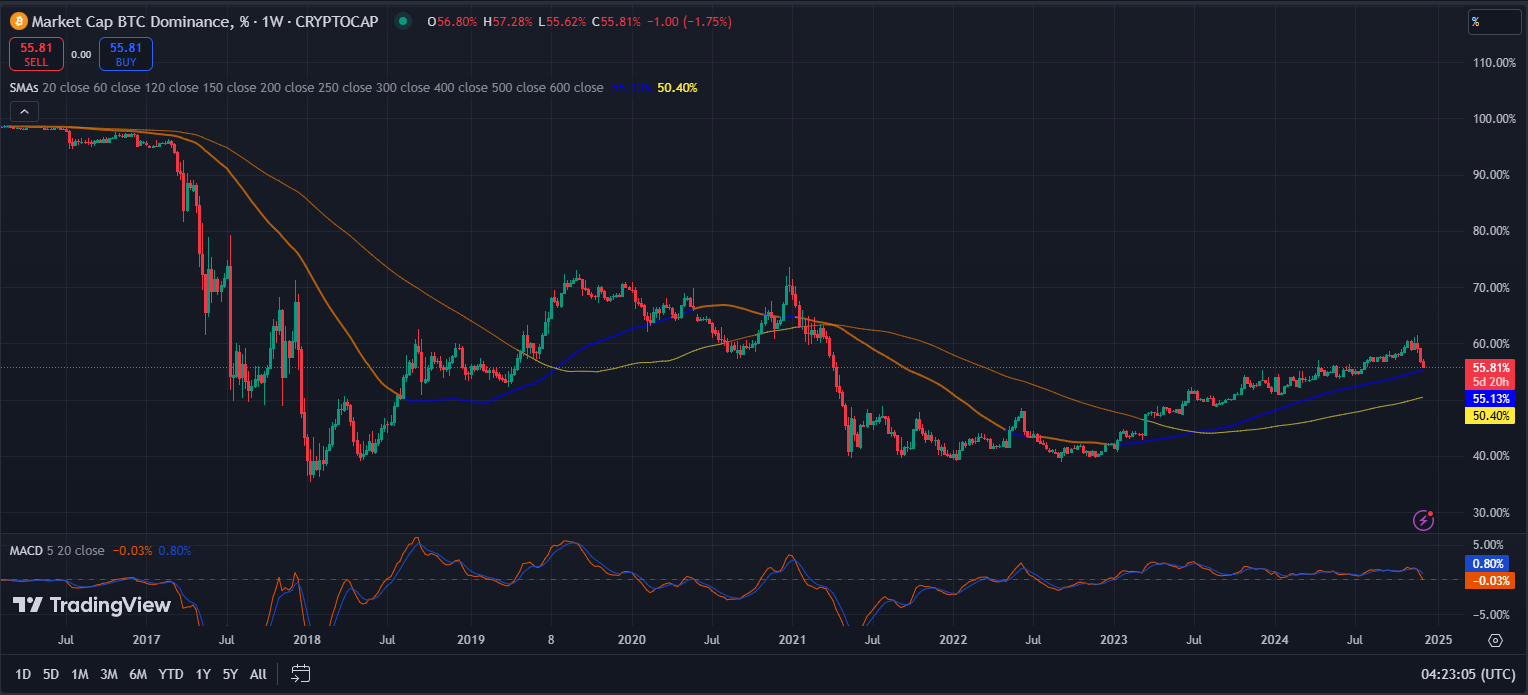 BTC 도미넌스가 60일 이동평균선을 이탈하더니 미친 듯이 빠지고 있습니다.