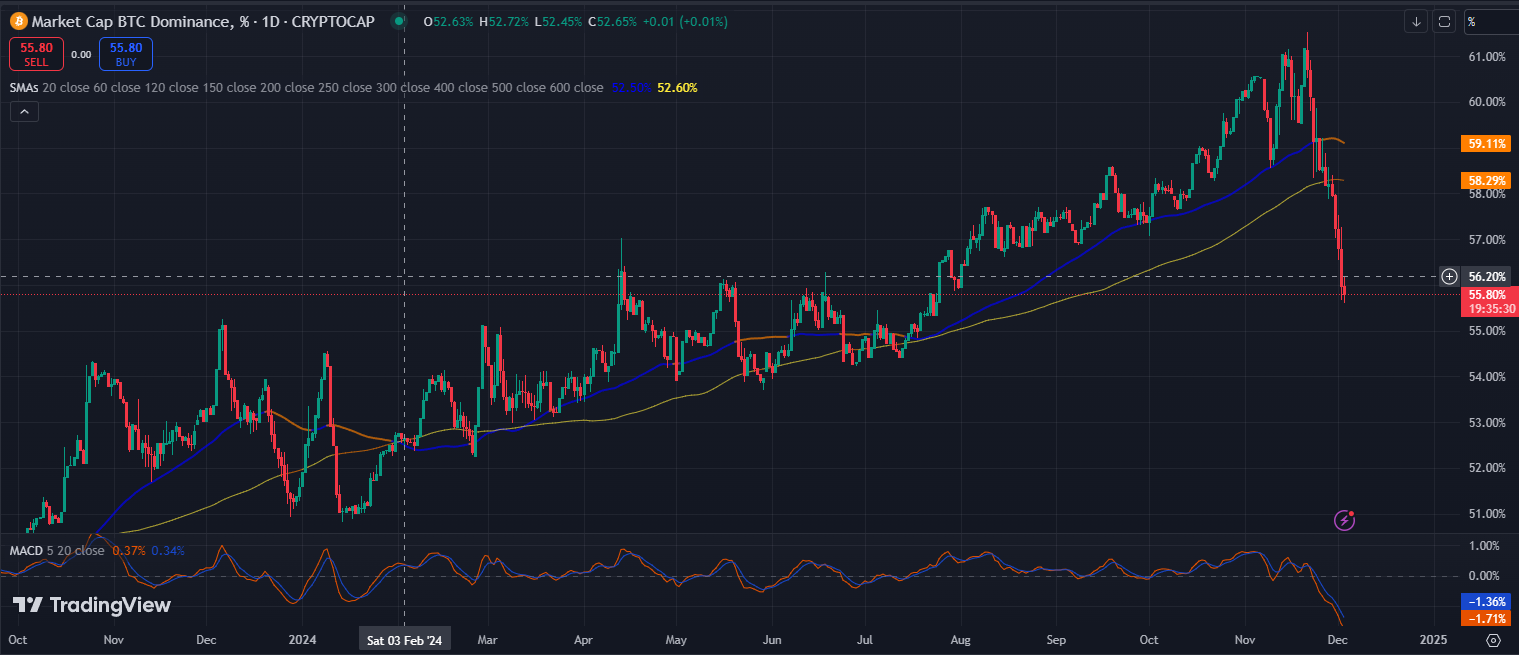 비트코인 도미넌스가 지난 11월 말에 전저점을 이탈하면서 급락이 나오고 있습니다.