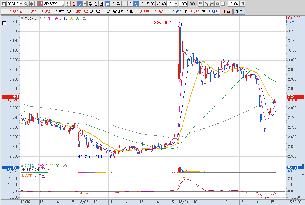 3,200원 근처에서 힘이 빠지는듯 보여서 매도하였습니다. 5분 봉으로 자세히 보면 정말 예술 적으로 매도했네요.
