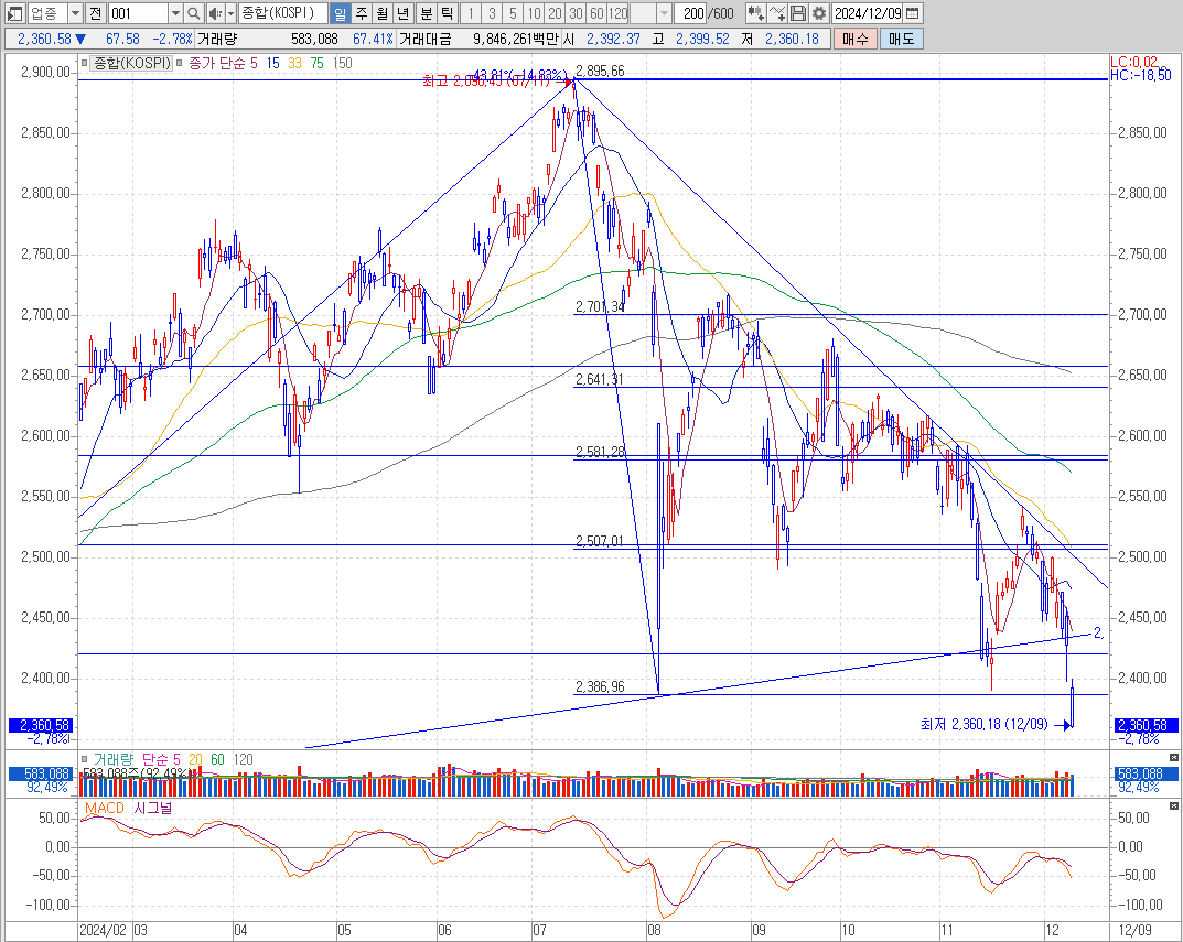 아래 사진 주봉으로 봤을 때, 2270, 2130 선까지 밀려도 아무렇지도 않은 상황까지 밀렸네요.
