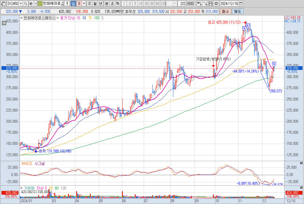 MACD가 0선 아래로 내려갔다가 상승하면서 시그널선과 골든크로스가 발생하고, 15일 이동평균선을 돌파할 때 매수 하였습니다.