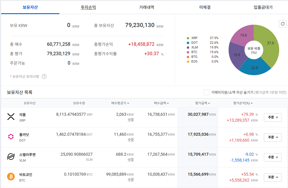 리플이 무려 80% 가까이 상승했습니다. 스텔라는 -9% 하락으로 아쉬운 성적이지만 폴카닷도 수익률이 괜찮았네요.