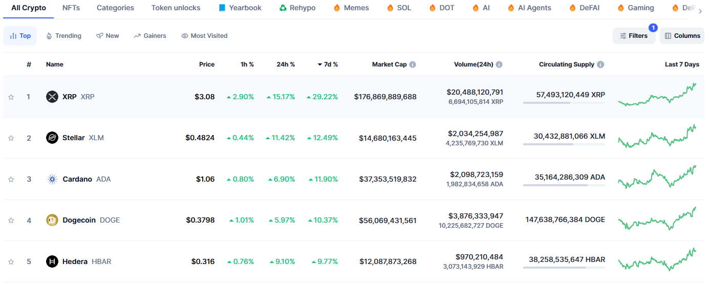 코인별로 보자면 리플이 많이 올랐네요. 스텔라도 많이 올랐고요. 솔라나만 조금 빠졌네요.
