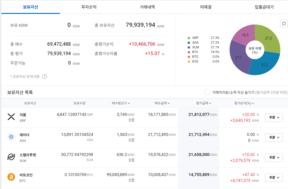 2주 전 총자산이 72,586,000원에서 이번 80,032,908원으로 +10.26% 수익으로 마감 되었습니다.