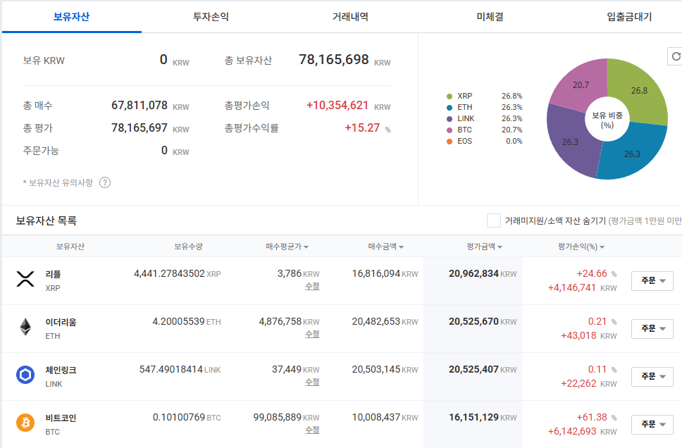 다음 비트코인이고, 체인링크 까지는 있는데 xrp는 주간 손실이었네요. 그럼 매수가능한 코인이 비트하고 체인링크 밖에 없는데, 일단 이번차수는 넘겨야 하나 고민이 되네요.