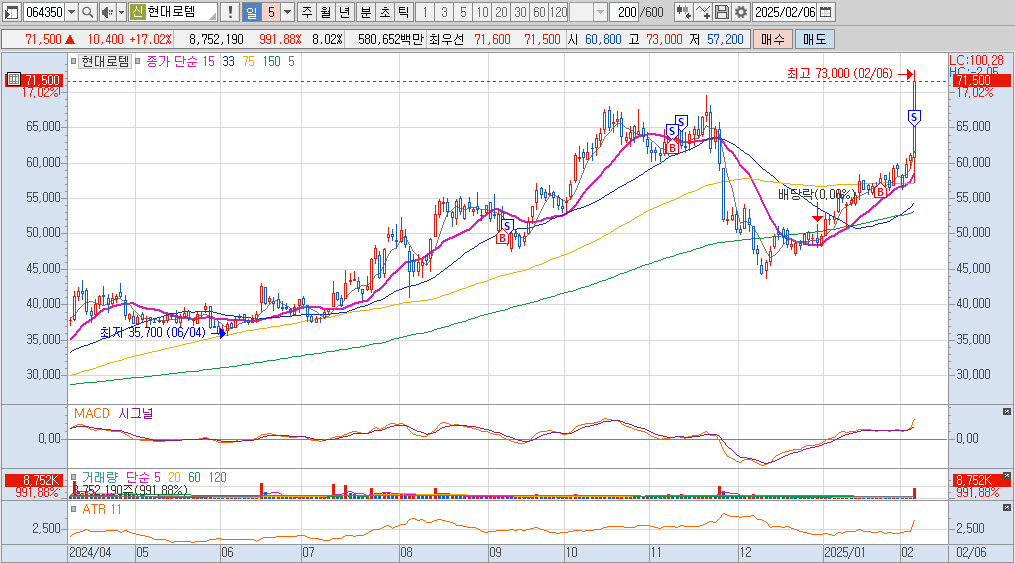 오늘 급등이 나와서 팔아야 하나 고민하고 있었는데 대장인 한화에어로스페이스가 지지부진해서 전고점을 시원하게 돌파하지는 못 하겠구나 생각하고 모두 매도하였는데 날아가 버렸네요.