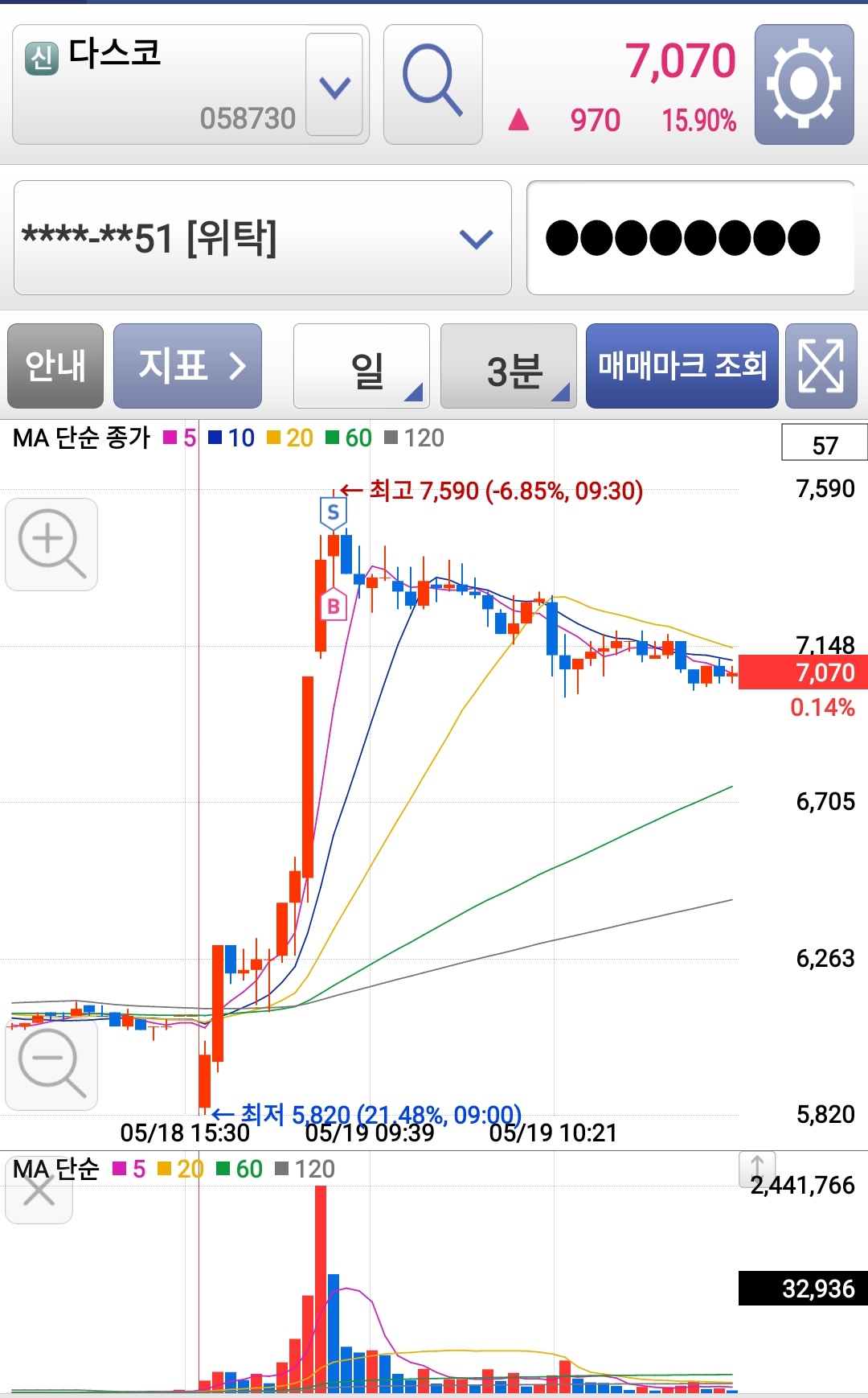 장중에 단타 검색식에 떠서 기준봉 매매로 들어갔습니다.
