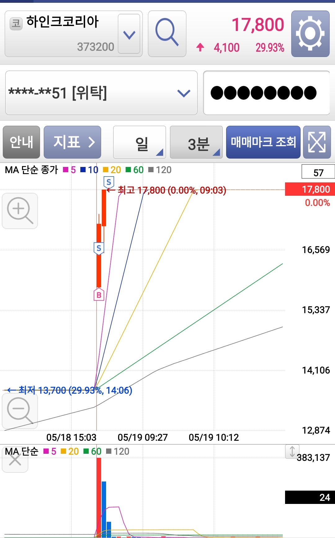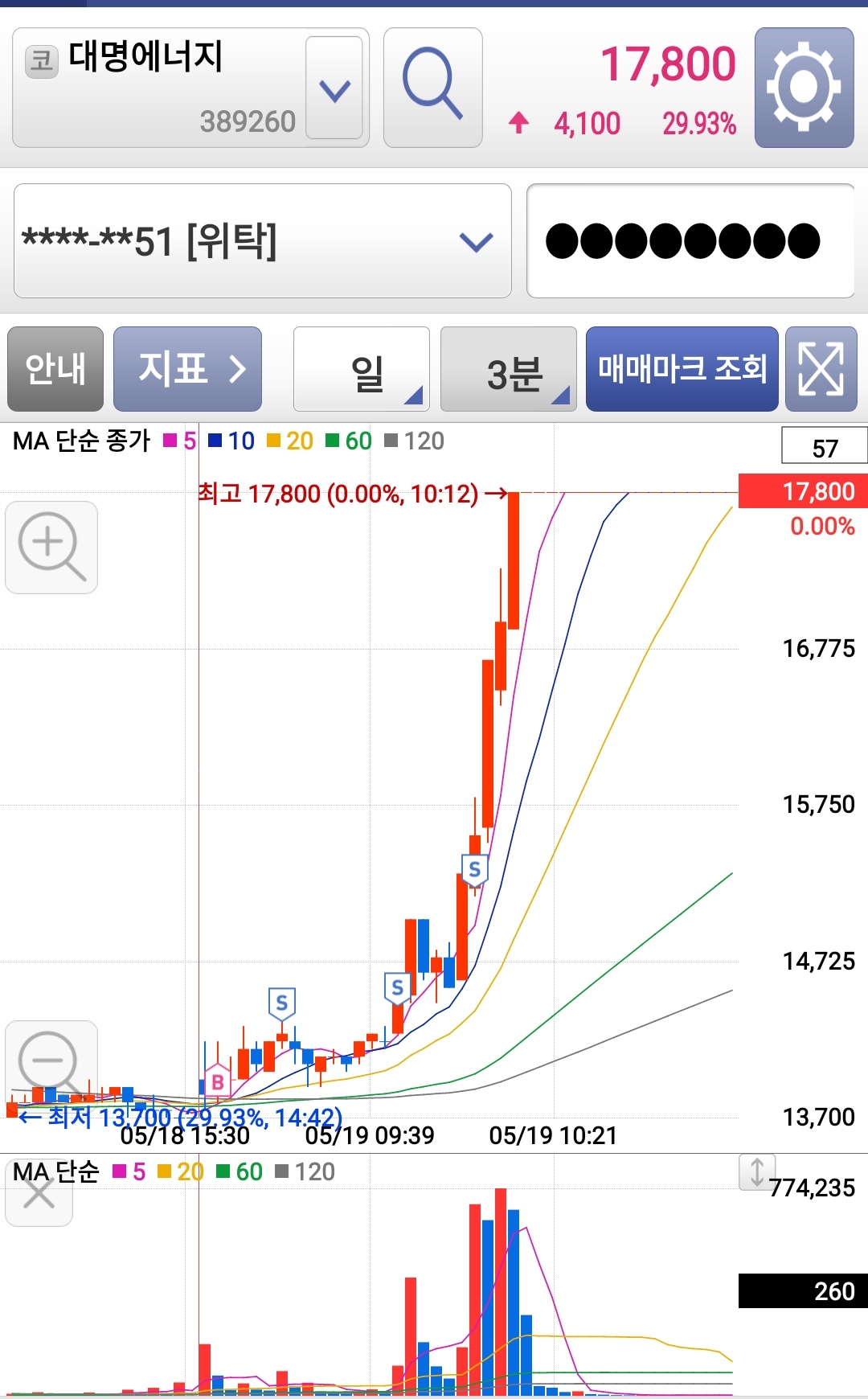 시작 전 가격을 보니 상한가에 들어갈 것 같은데 높은 것도 아니고 낮은 것도 아니고 해서 시가 배팅 들어갔습니다.