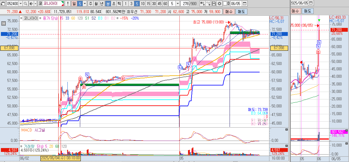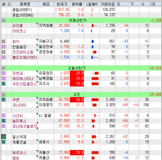 오늘 시장은 정책주들이 잘 가는 시장이었네요. 양시장 모두 크게 상승해 주었고요. 시장이 좋으니까 어제에 이어서 짤짤이도 잘 되는 것 같습니다. 정책 관련 종목들도 정말 다양하네요. 남북경협, 에너지, 지주사, 지역화폐, AI, 세종시, 저출산 이렇게 좋게 움직인 섹터입니다. 그중에 대장은 지역화폐라고 볼 수 있겠네요. 코나아이는 시총이 1조인데 오늘 거래대금이 8천억이네요. 선수들이 들어와서 회전을 엄청 돌렸나 봅니다. 신나는 시장이네요.