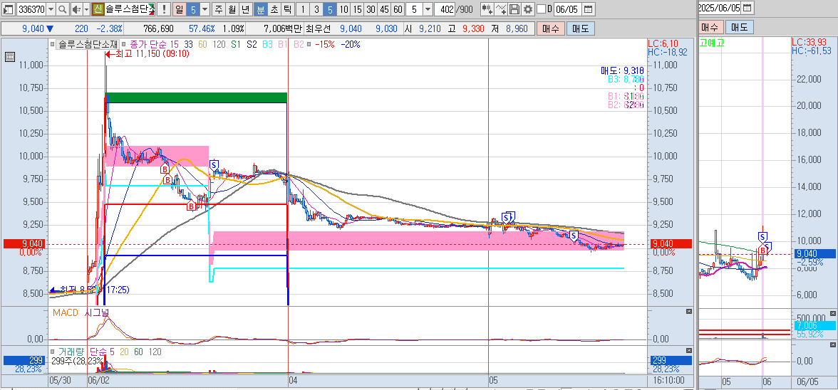 솔루스첨단소재는 6월 2일에 강하게 움직여 주고 밀릴 때 F존 매매하였는데요. 본전에 조금 팔고 더 가겠지 버티다가 크게 손절했습니다. 결과론 적으로 이종목은 약수익이나 본전 탈출할 수 있는기회가 많았습니다. 매수한 당일 매매를 끝냈으면 어떻게든 마무리가 잘 되었을 것 같은데 -7.4%나 손절하였습니다.