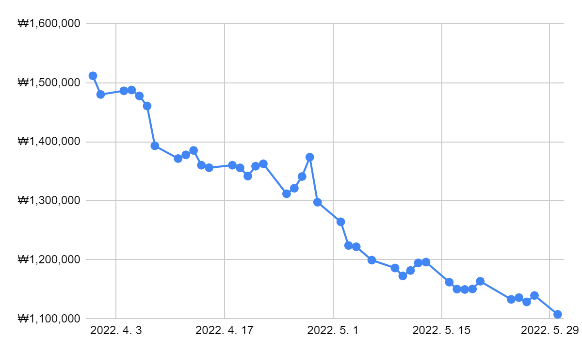 잠깐 올리는 척만 하다가 쭉쭉 빠짐. 손절선 제대로 못 지켜서 손실 커짐.