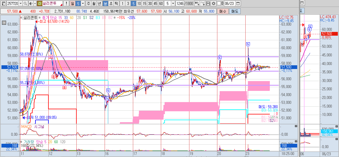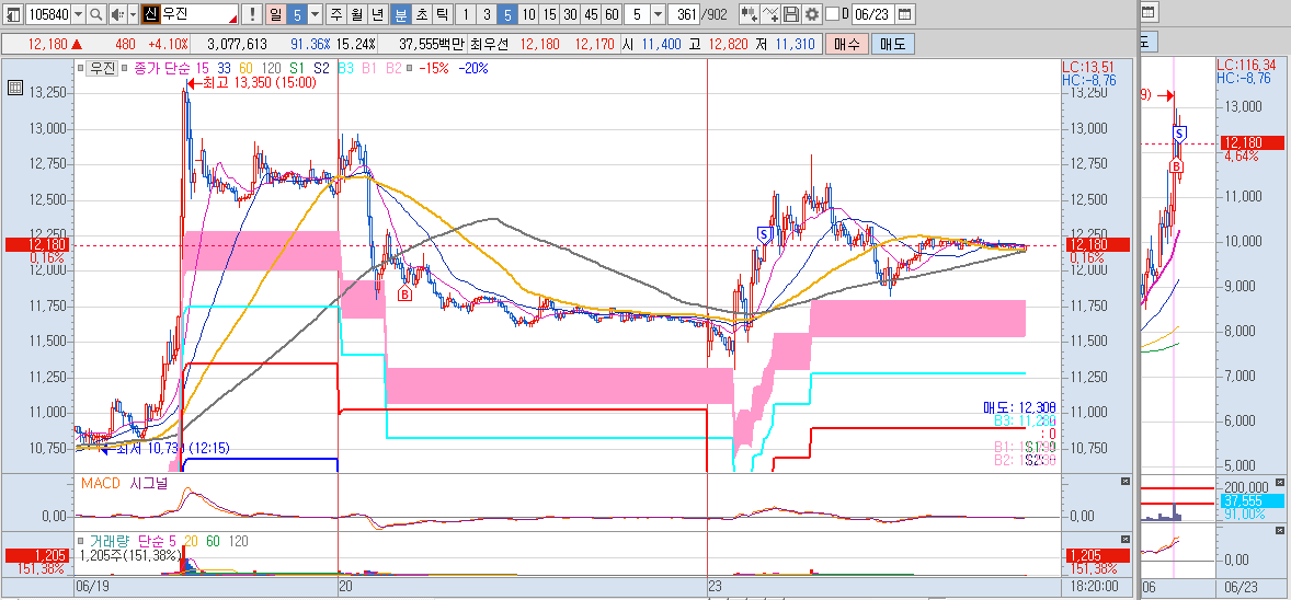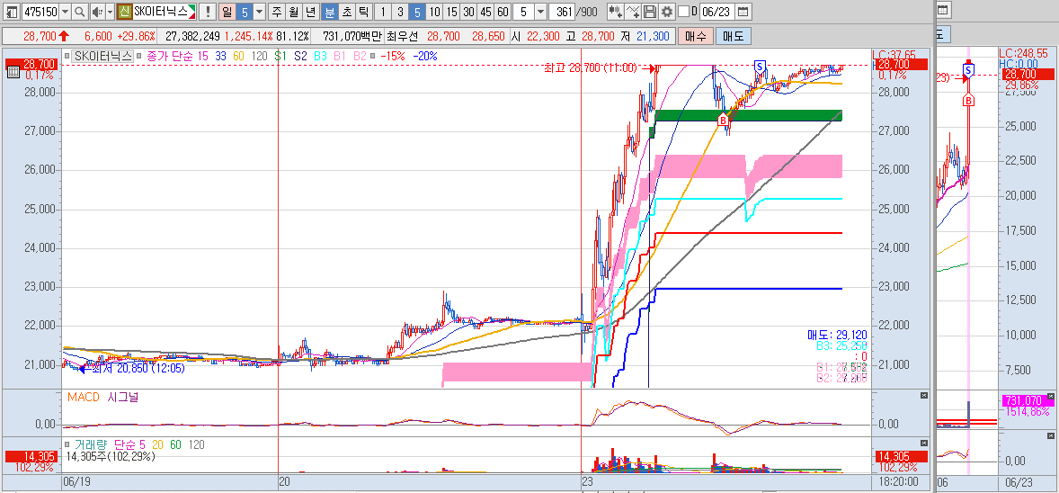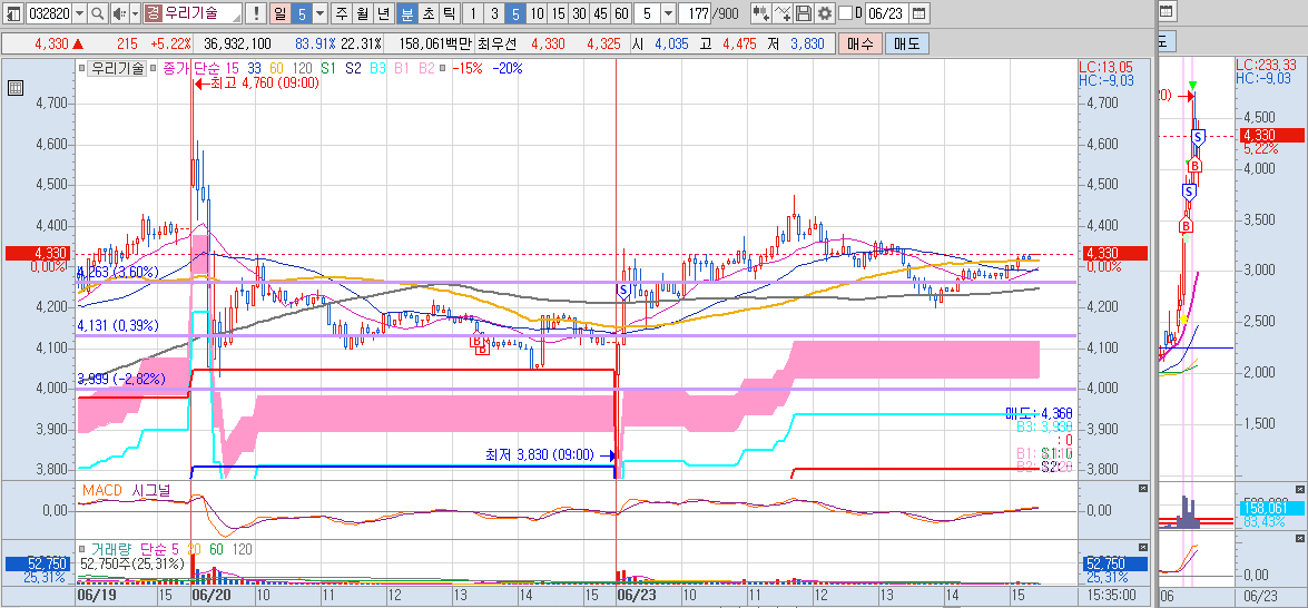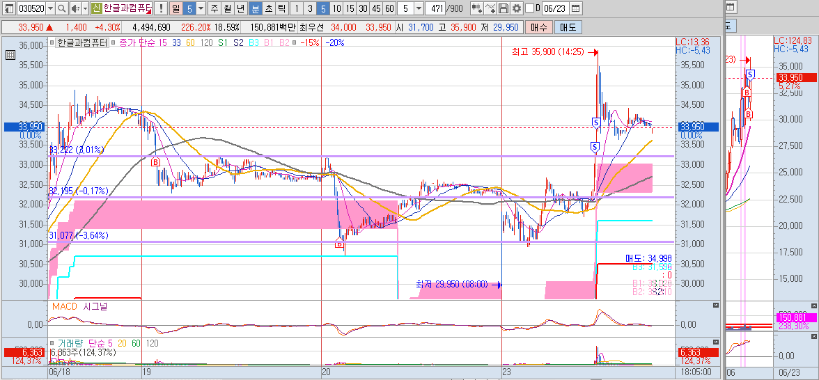 한글과컴퓨터는 6월 18일 기준봉 다음날 진입하였습니다. 기준봉 종가 대비 -10% 가까이 빼버리네요. 버티기 정말 힘들었습니다. 추가 매수를 한번 하고 나서 바로 올라 주었지만 추가 매수했던 라인을 다시 한번 위협할 때 손절해야 하나 엄청 고민했었는데요. 오늘 잘 올려줘서 +3.4% 수익마감 하였습니다.