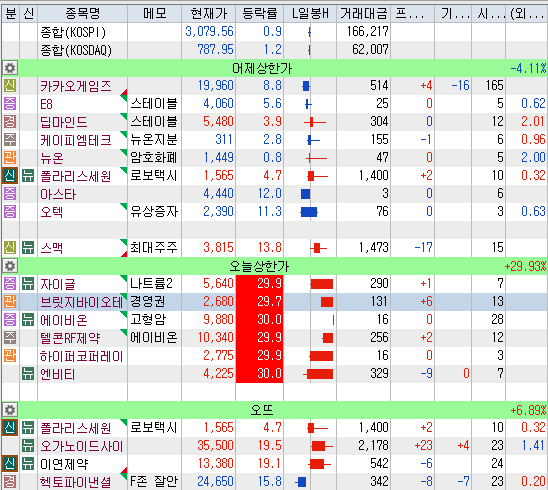 시장이 오랜만에 그게 조정이 왔네요. 코스닥이 조금 더 많이 빠졌고요. 조정장이다 보니 대부분 윗꼬리 달리고 재미없는 장이었습니다. 특히 한동안 잘 오르던 스테이블코인관련주들의 급락이 정말 심했네요. 한은에서 스테이블코인의 위험성 코인런등에 대한경고를 했다는데 아니 그걸 뭐 모르고 있었던 것도 아니고 새삼스럽게 지껄여 가지고 관련주들이 다 개박살 났네요. 특히 네이버, 카카오가 많이 빠졌네요. 장이 좋지 않아 상한가 종목도 별로 없긴 한데 꾸준히 3 연상을 달리고 있는 종목들이 있네요 에이비온, 에이비온지분을 가지고 있다는 텔코RF제약, 경영권 분쟁 브릿지바이오테라퓨틱스 근데 무서워서 들어갈 수가 없네요.