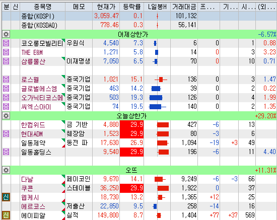 몇 종목 처물려 있고 몇 종목 매수만 해서 오늘은 확정된 매매가 없네요. 간단하게 시장 정리만 해보겠습니다. 지수는 몸통이 좀 있는 십자도지양봉 강보합이네요. 어제 대거 상한가에 들어갔던 중국기업들은 갭을 그럭저럭 잘 주고 다 빠졌습니다. 스테이블 코인 관련주들이 모두 좋았습니다. 한컴위드는 금 기반 스테이블코인 관련 뉴스로 상한가에 들어가고 다날은 거래대금이 9천억이 넘게 터져서 하이닉스보다도 많네요. 상승폭도 좋고요. 어제 저출산 정책 관련 뉴스로 저출산 주들이 좋았는데 오늘 조정이 꽤 많이 나왔습니다. 화장품 미용기기도 나쁘지 않았는데요 특히 에이피알이 좋았네요. 일동제약은 오늘 동전파스를 국내 판매한다는 뉴스가 있던데 그거 가지고 상한가 갈 일인가 싶네요. 저는 동전 파스가 잘 안 맞던데 ㅋ 일동홀딩스도 상한가에 들어갔는데 두 종목은 왜 상한가 인지 이유를 찾기가 쉽지 않네요.