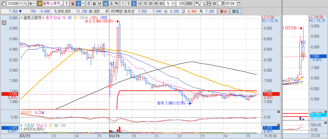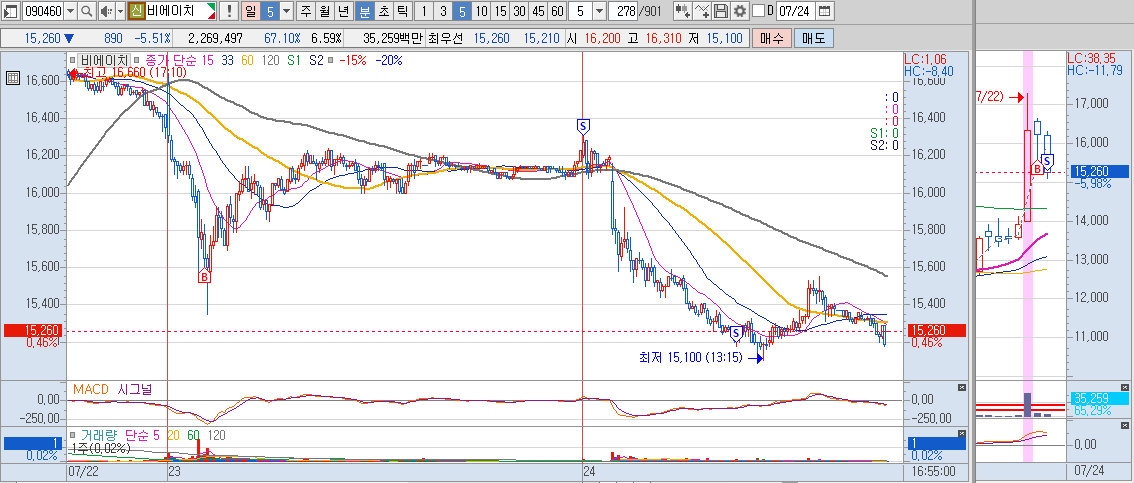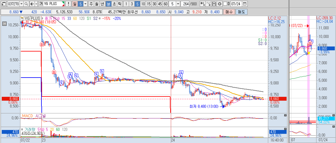 이건 화요일 22일 기준봉을 보고 눌림 진입을 한 것 같은데 진입 타점이 이상하네요. 눌림도 다시 정리해야겠습니다. 끝없이 질질 흐르는 거 오전에 모두 정리했습니다. -5.4% 손절 입니다.