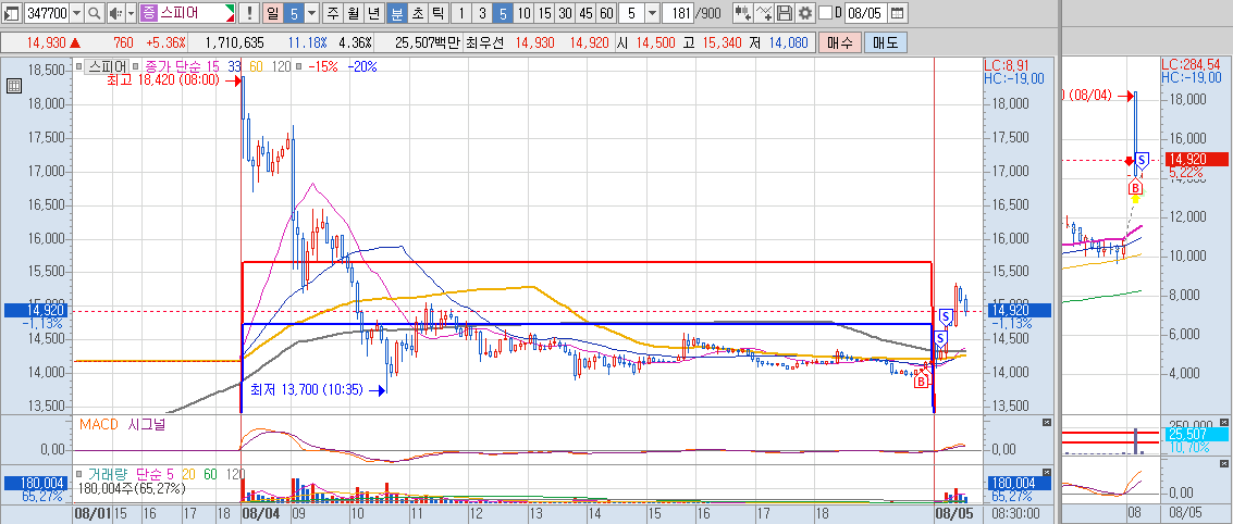 스피어는 스페이스엑스와 계약 뉴스로 전일 쩜상이후에 어제 시초가 점상한가에서 하루 종일 흘러내리면서 거래량이 2천억이 넘게 터져서 장대음봉 종가베팅 개념으로 진입하였습니다. 아침 프리장에 다 팔았는데 슈팅 나오기 직전에 다 털렸네요.
