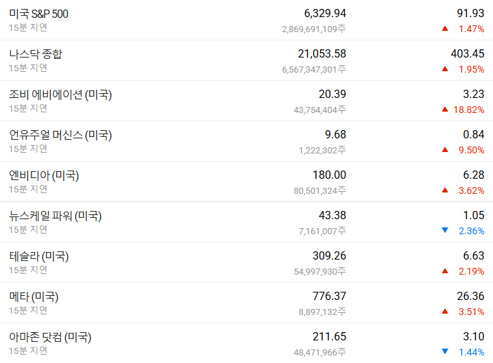 미국시장은 다시 활활 타오르네요. 조비, 언유주얼이 크게 올랐습니다. 드론주에 영향이 있는지 봐야겠고요. 아마존, 뉴스케일파워는 어제에 이어 여전히 비실비실하고, 엔비디아는 또 크게 상승하면서 종가기준 신고가네요.