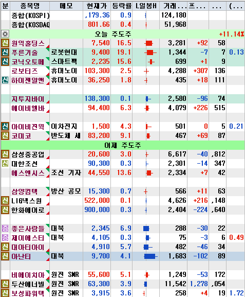 장이 마감되었습니다. 오후까지도 로봇섹터가 시장을 주도 했고요. 조선, 방산, 대북, 원전은 이제 관종에서 빼야 하나 고민이네요.