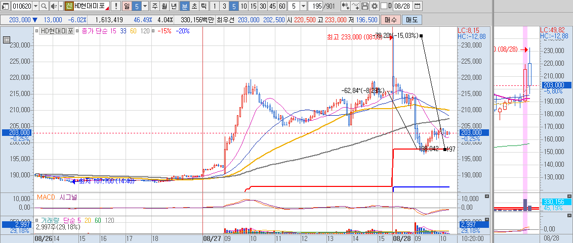 오전에 HD현대미포가 크게 급락해서 이거 들어가야 되나 말아야 하나 계속 망설이다. M4에 오면 들어가야지 하면서 계속 보고 있었는데, 진짜 자리에 오니까 두려워서 매수 버튼을 못누르겠더라고요. 대형주에 이슈가 아직 남아 있는 종목이었는데 비중을 좀 많이 넣을 수 있는 기회였는데 쫄아서 진입을 못했네요. M4에서 진입했으면 +4% 이상 수익을 낼 수 있었겠네요. 다음에 또 이런 기회가 온다면 반드시 진입해 봐야겠습니다. 수익을 보장하지는 못하겠지만 손절하더라도 이런 건 시도했어야 맞다고 생각이 드네요.