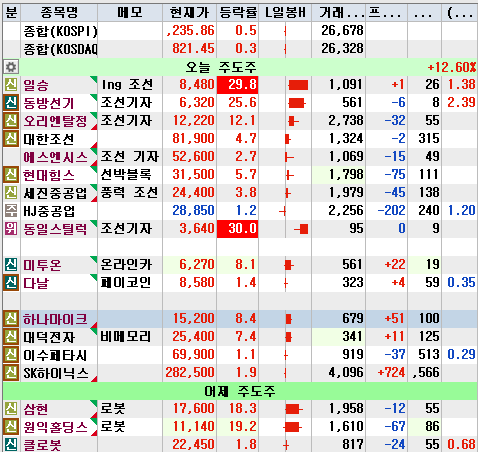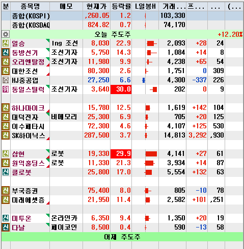 오늘도 조선이 주도 섹터라고 봐야겠습니다. 일승이 조금전에 상한가에 들어갔는데 키움매수세가 없네요. 풀리면 sf존 매수 한번 해봐야겠습니다. 로봇주들도 움직임이 좋고요. 반도체섹터가 조금씩 움직이고 있습니다.