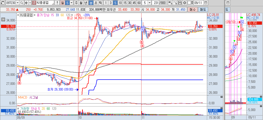 골드존 승률이 괜찮은것 같아서 꾸준히 매매를 해보려고 합니다. HJ중공업은 골드존/하트존 둘다 검색이 되었는데요. 하트존은 장중에 움직여서 정확한 매매타점을 잡기가 쉽지 않네요. 골드존 하트존이 섞인 애매한 타점에서 매수가 되었는데요. 매수되자마자 평단 +3%에 기계적으로 매도 걸어 놨는데 잘 매도되었습니다.