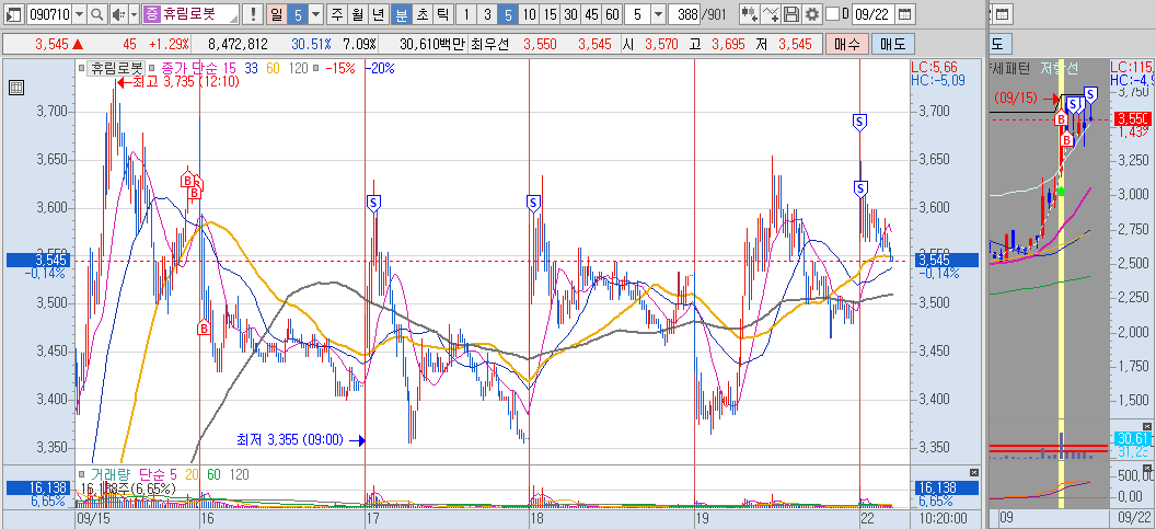 휴림로봇을 5 거래일만에 약수익 탈출 했습니다. 로봇주들 참 쉽지 않네요. 9월 15일에 휴림로봇을 주도주로 보고 종베진입했고요. 아침에 낙폭이 커서 하트존에서 추가매수를 했습니다. F존에도 걸어두었는데 아슬아슬하게 안 오고 날마다 아침에 반등을 줬네요. 계속 걸어두었던 본탈에 팔리다가 오늘 전량 털었습니다. 그래도 +0.86% 수익 마감하였습니다. 지나고 나서 생각이지만 이놈은 매일 종가 베팅했으면 매일 아침 5% 이상 수익이 났었겠네요. 오래 물려서 고생했지만 그럭저럭 잘 털고 나왔습니다.