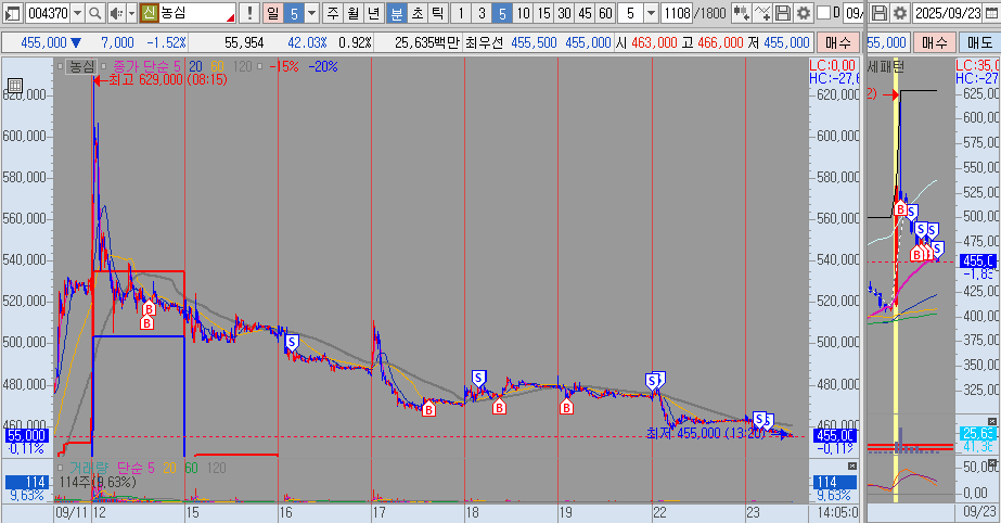농심은 지난번 피뢰침 들어가서 18일에 손절하고, F존에 와서 F존플러스 개념으로 다시 진입하였습니다. 기준봉에서 너무 멀어져서 이제 완전히 식다 못해 죽어 버린 것 같아서 오늘 모두 손실 처리 했습니다. 최종 -1.14% 손절입니다.