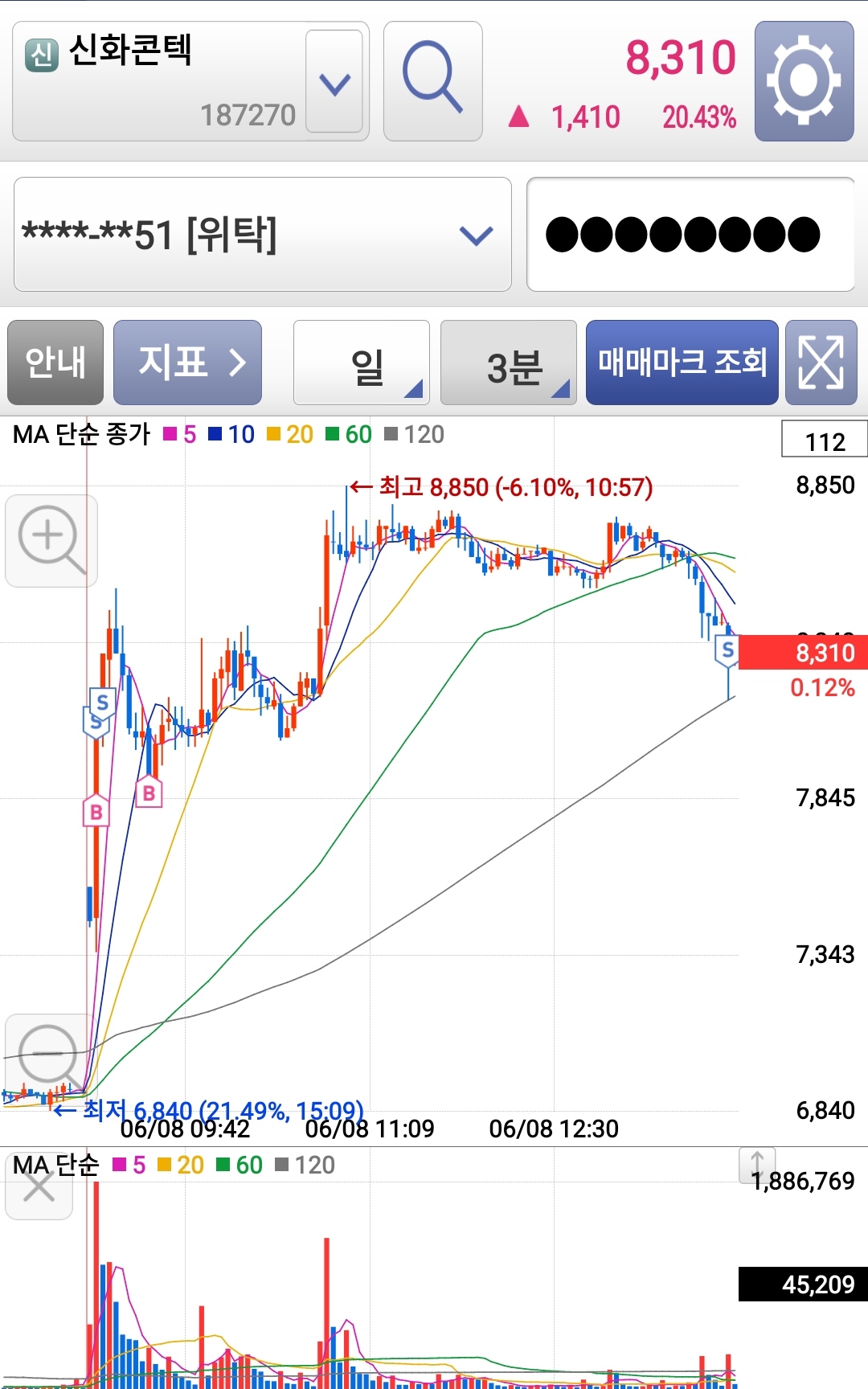 어제 종가 부근에서 모은 퍼스텍과 관심종목 중 신화콘텍을 매매하였습니다.